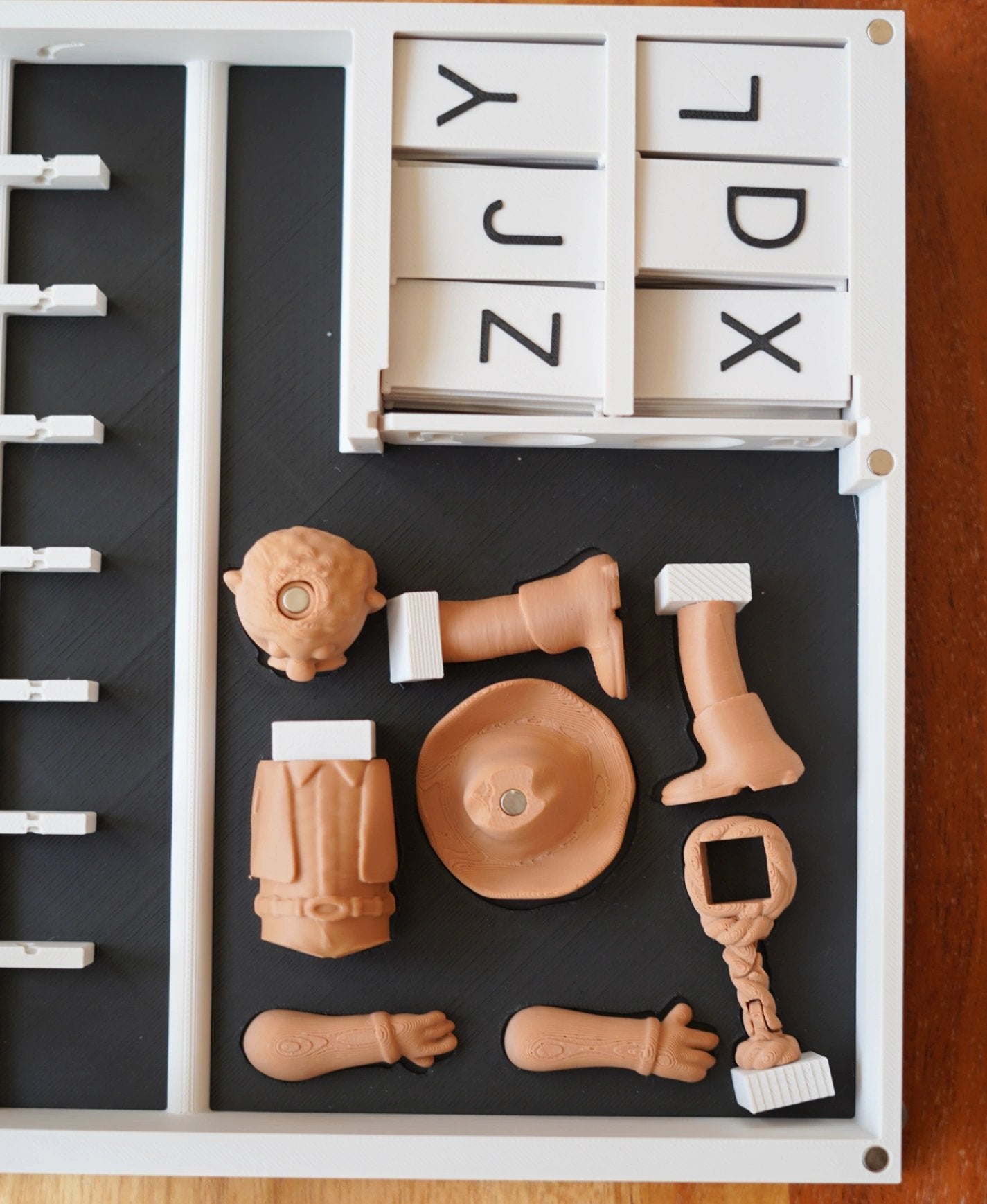 This looks like a book when you're not playing. So you can store it anywhere! And since the covers hold together with magnets, all your pieces are secure inside. There are magnets to hold all the body parts, and slots for all the letters.
